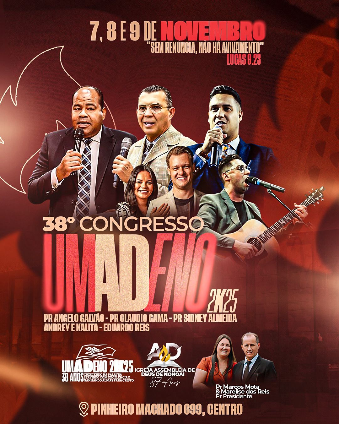 38º CONGRESSO UMADENO 07 nov, 2025 19HS RUA PINHEIRO MACHADO 699 CENTRO NONOAI 38º CONGRESSO GERAL DE JOVENS UMADENO DA ASSEMBLEIA DE DEUS DO CAMPO DE NONOAI RS